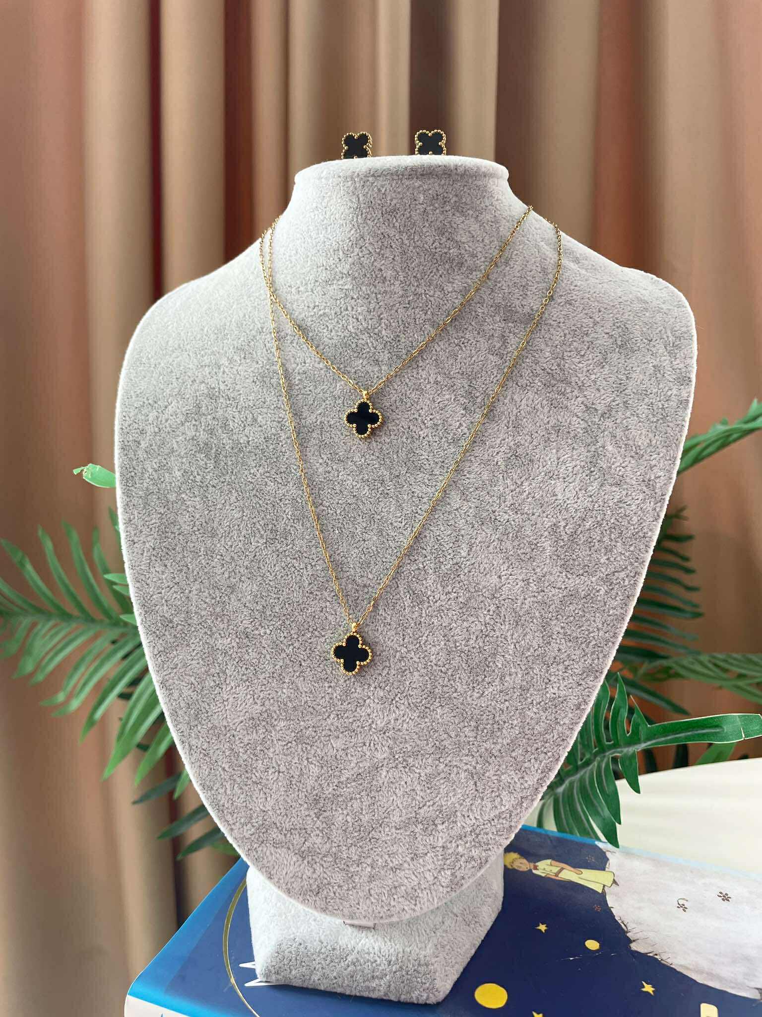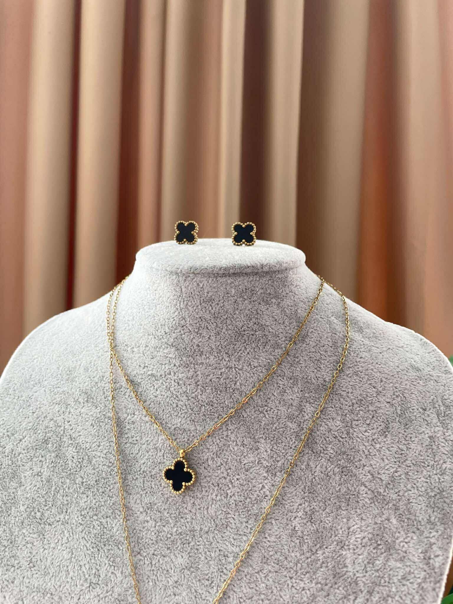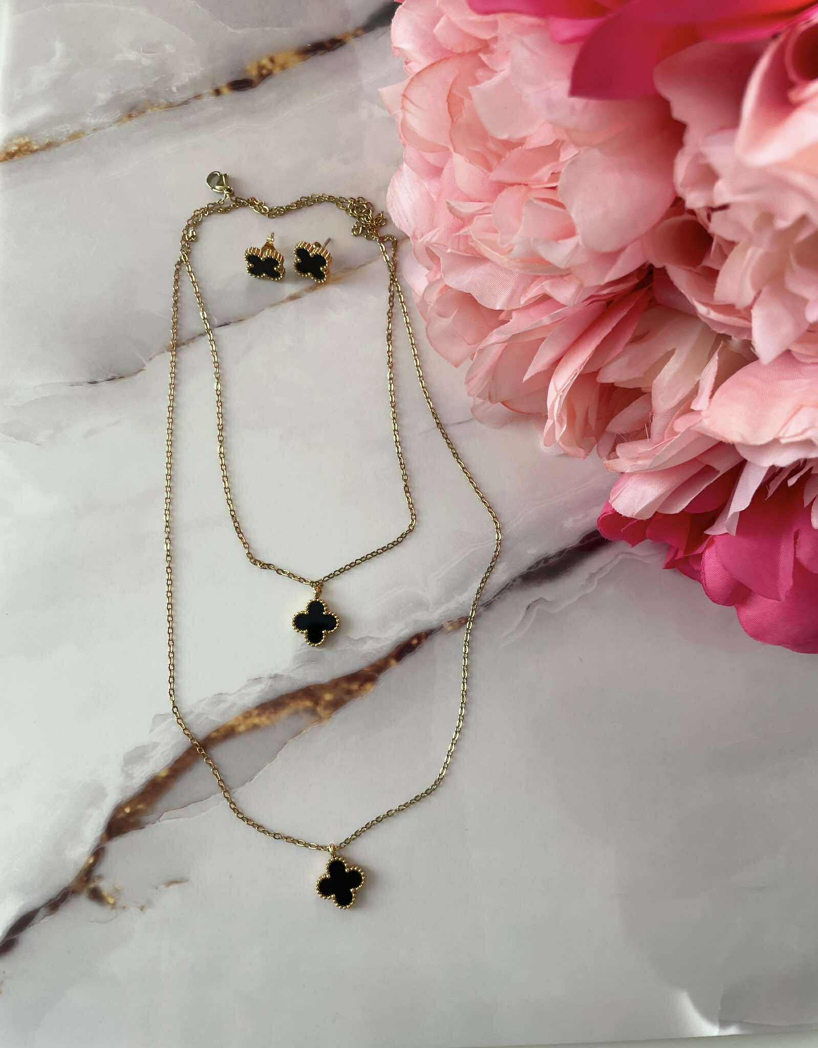 Дизайн: Цвят метал- златист, черен. Сетът включва двойно колие и обеци