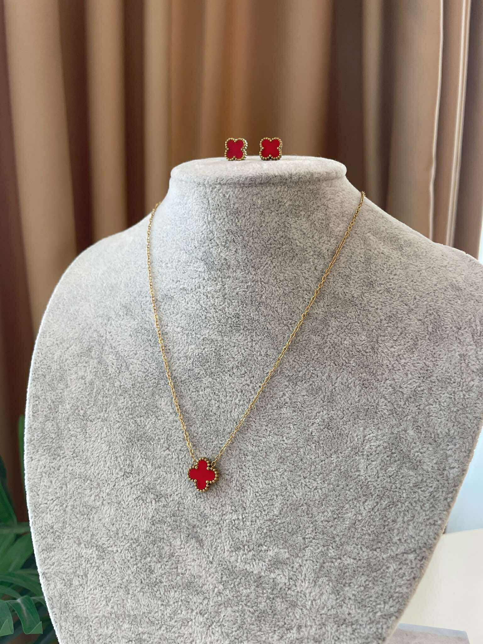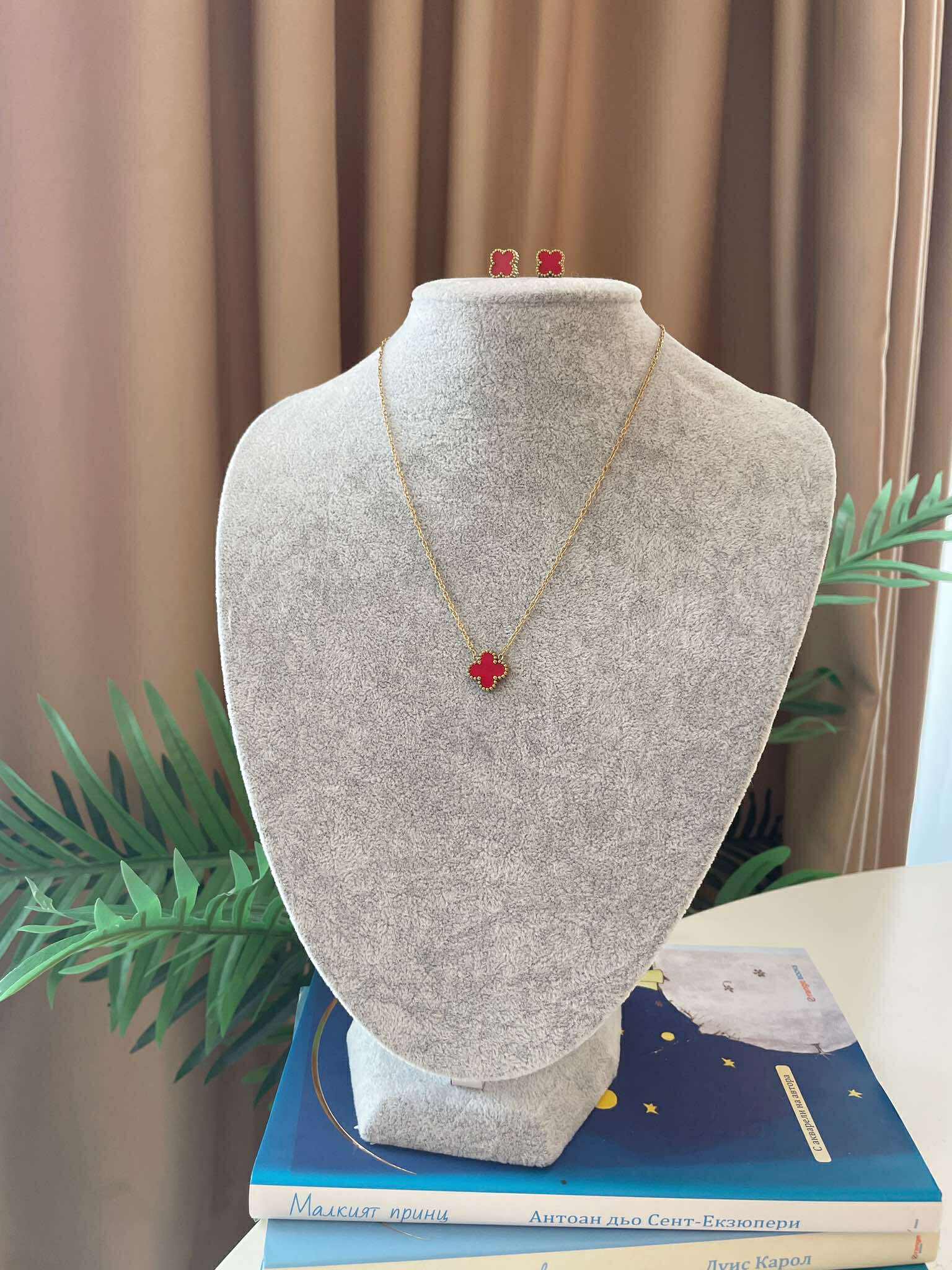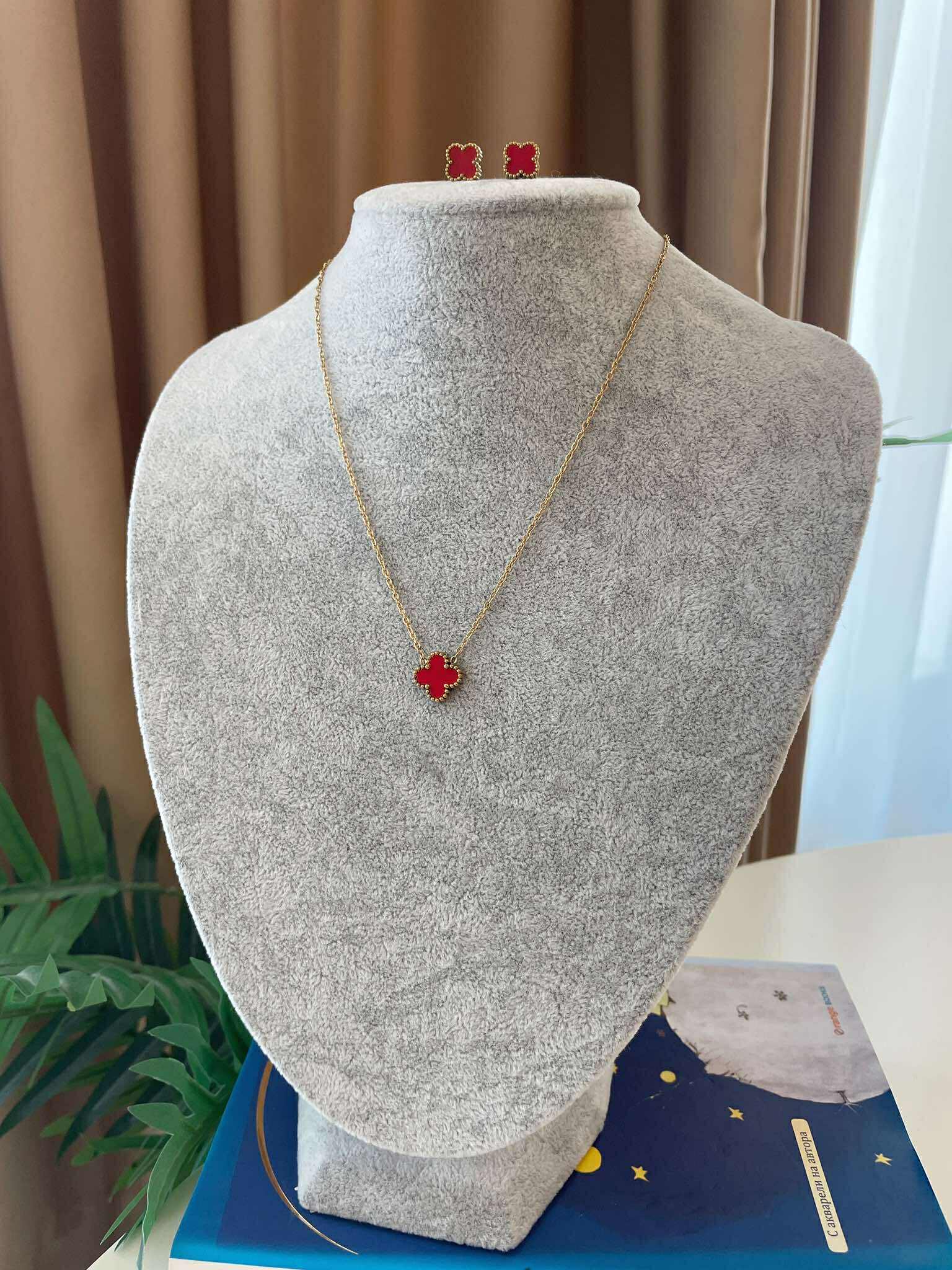 Дизайн: Цвят метал- златист, червен. Сетът включва колие и обеци