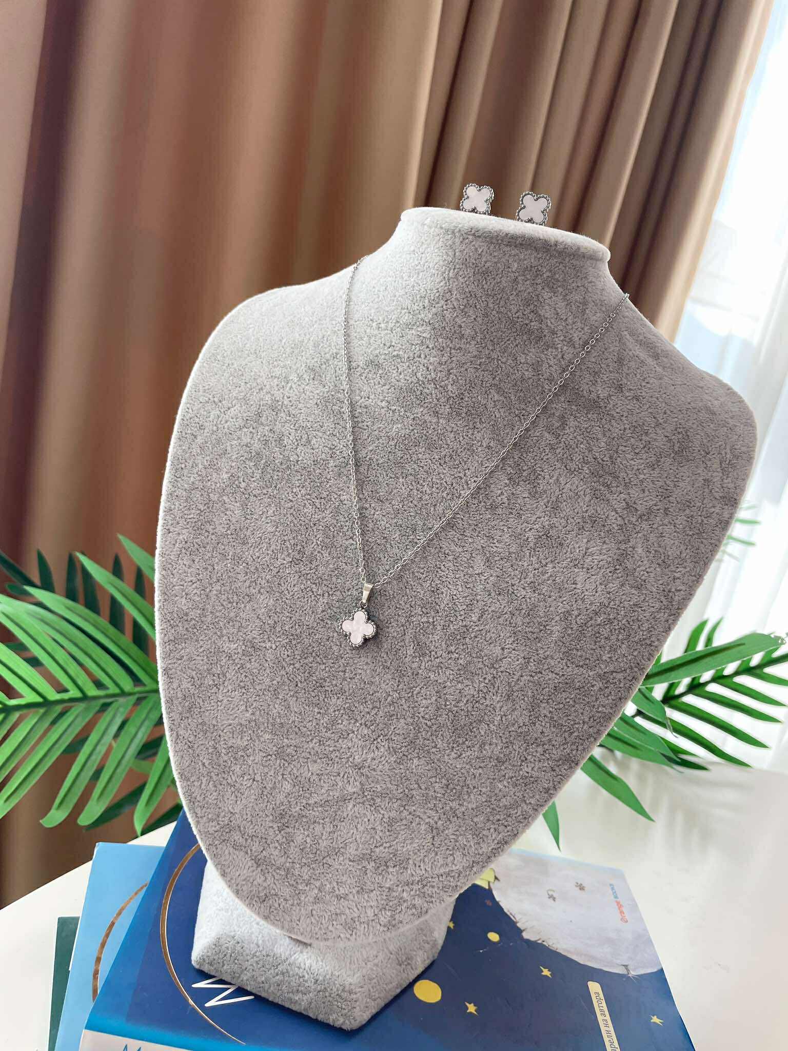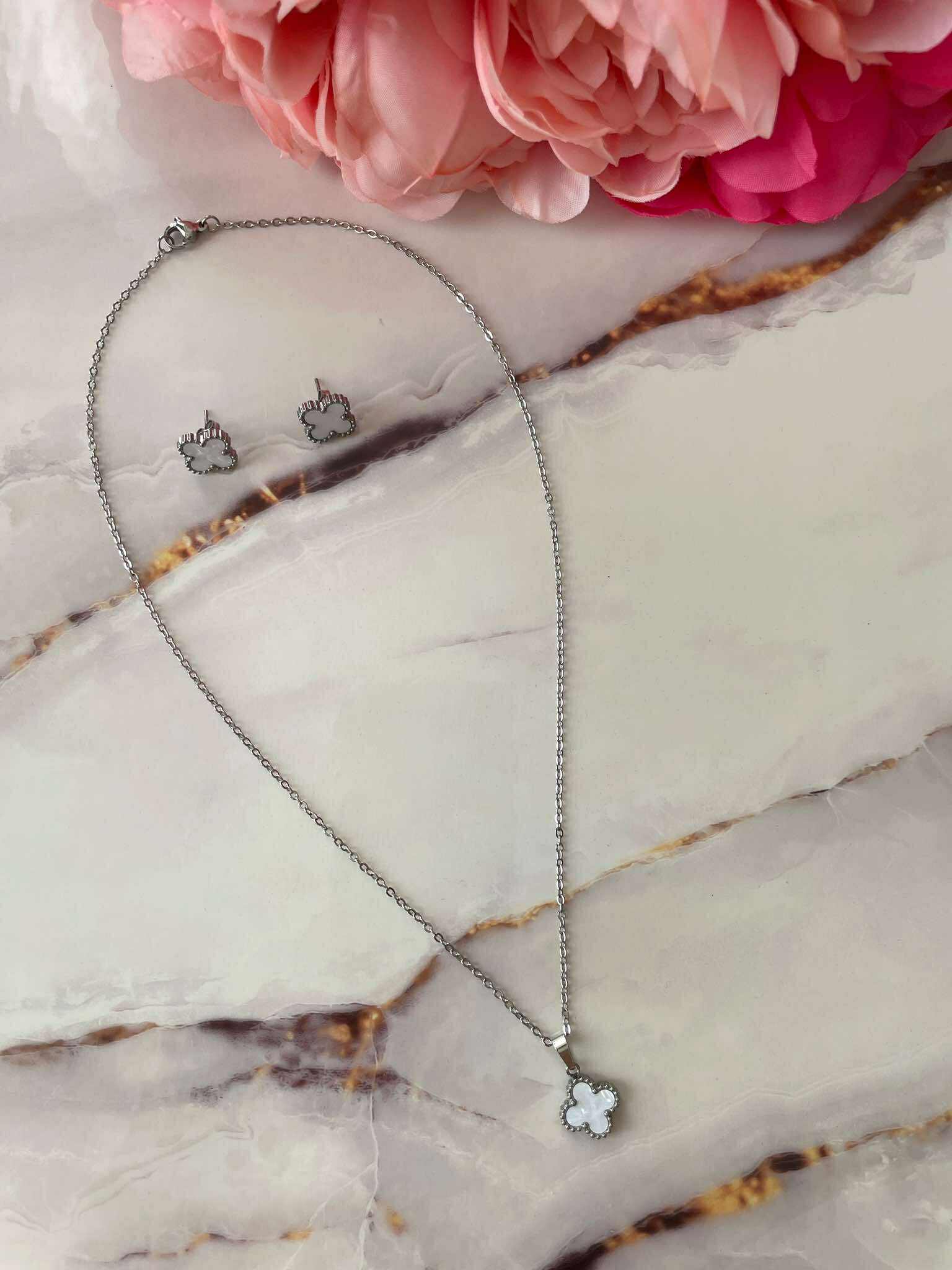 Дизайн: Цвят метал- сребрист, цвят декорация – бял . Сетът включва колие и обеци