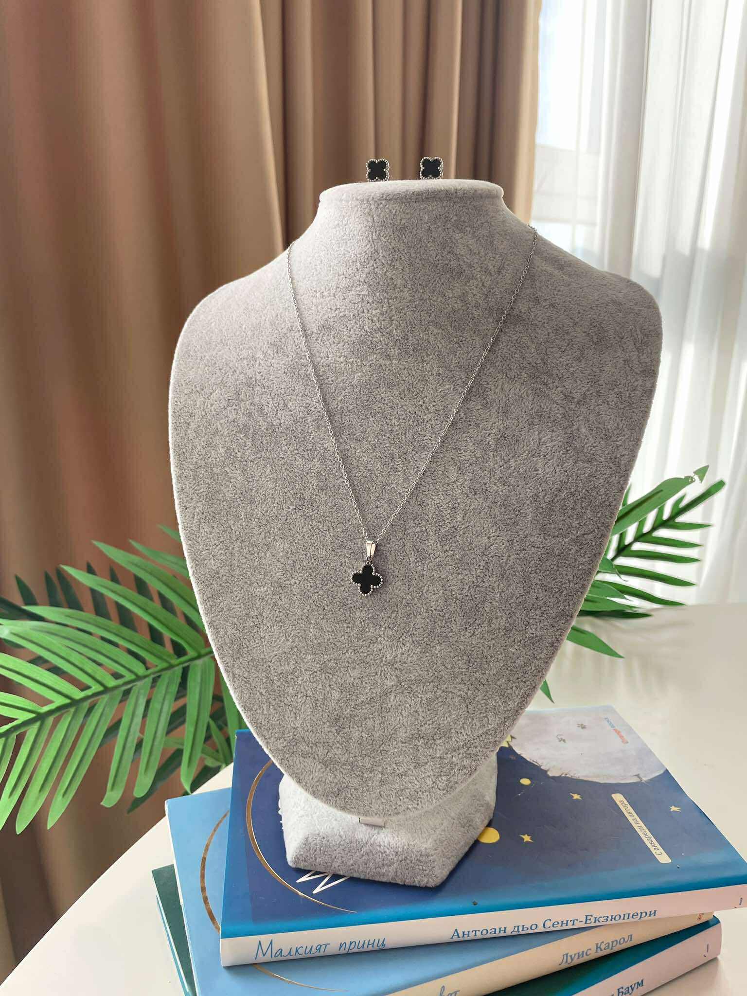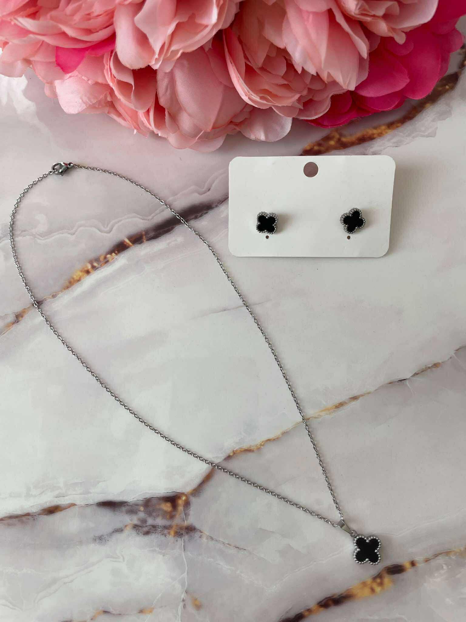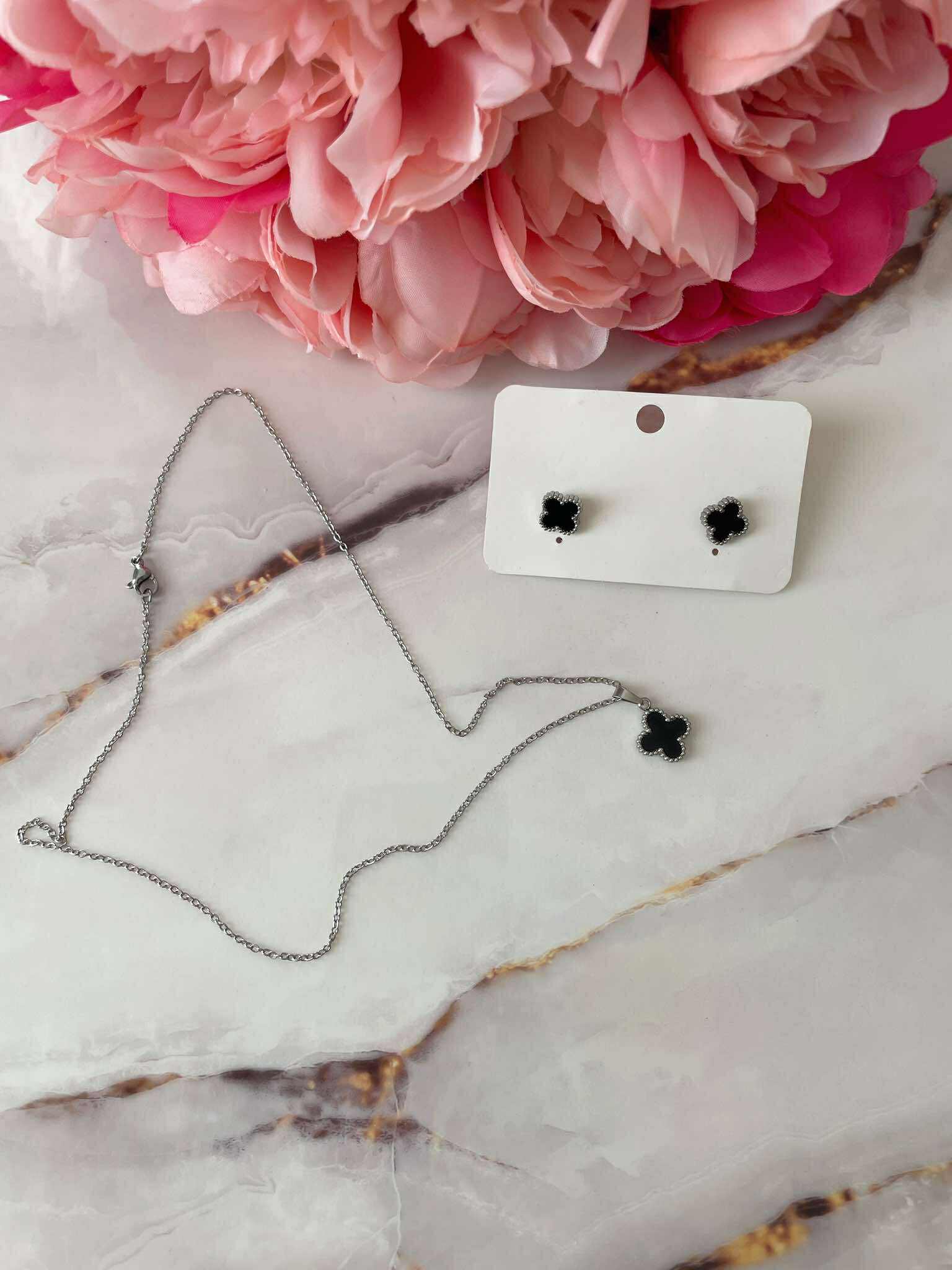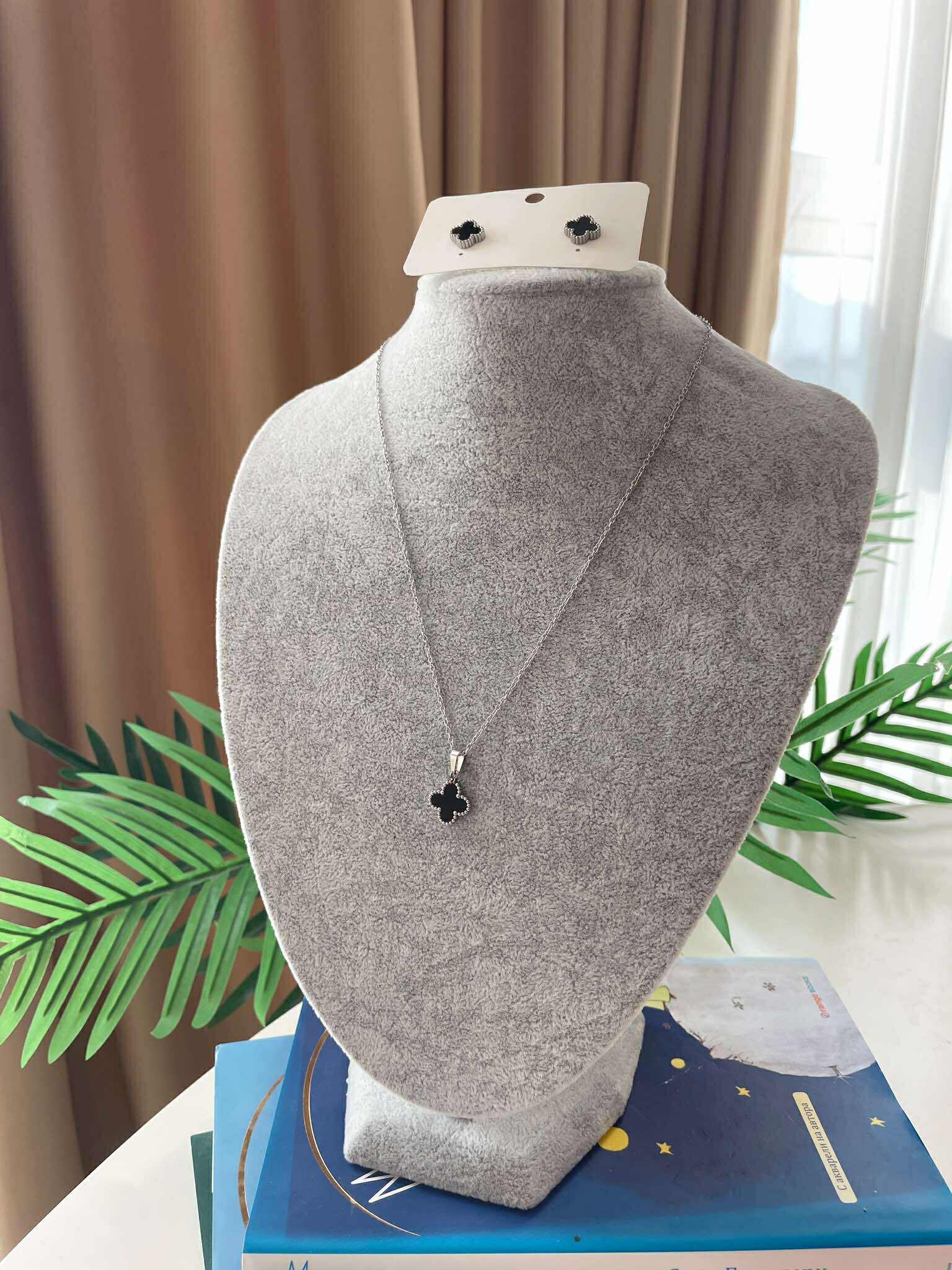 Дизайн: Цвят метал- сребрист, цвят декорация – черен . Сетът включва колие и обеци