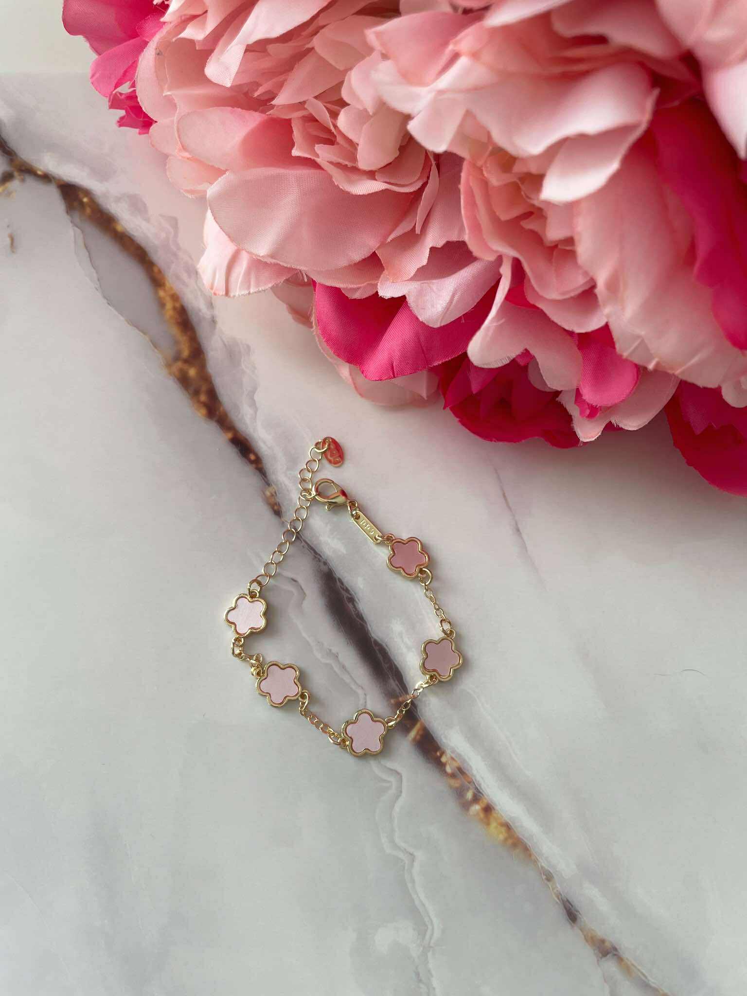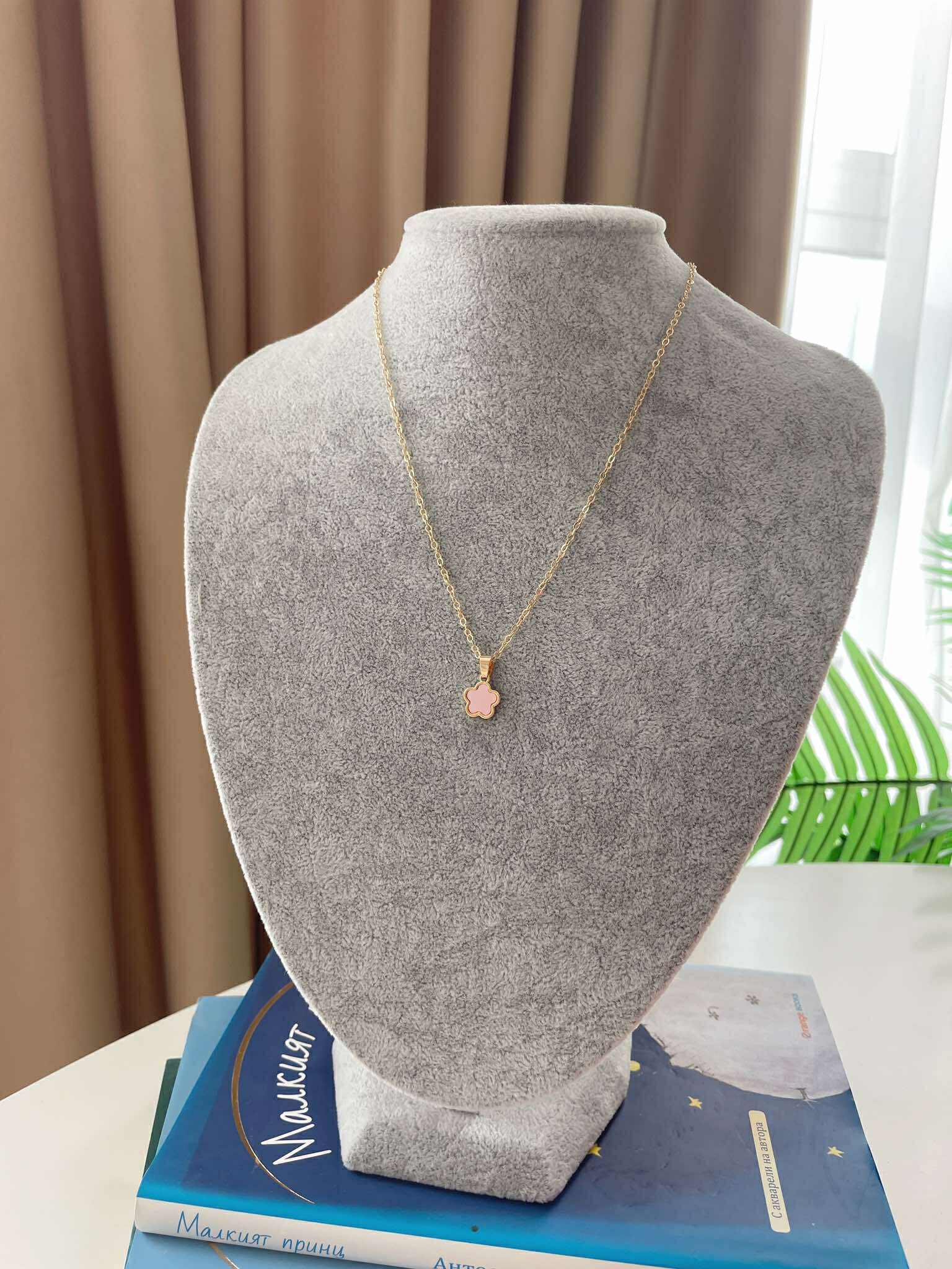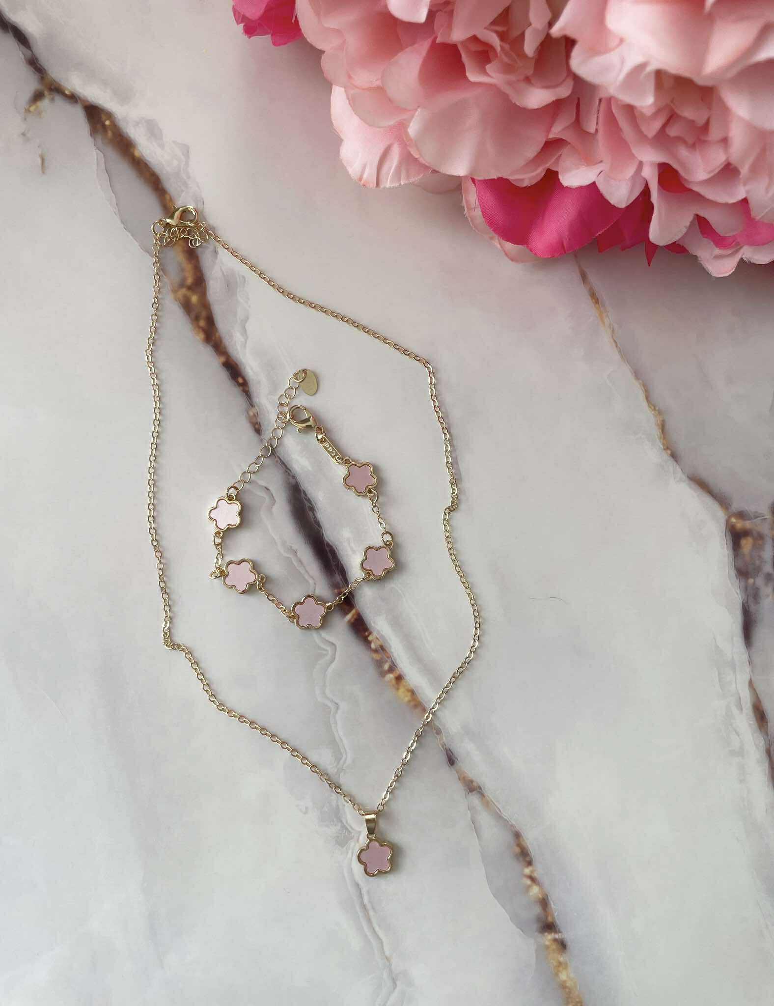 Дизайн: Цвят метал- златист. Цвят декорация – розов. Сетът включва колие и гривна