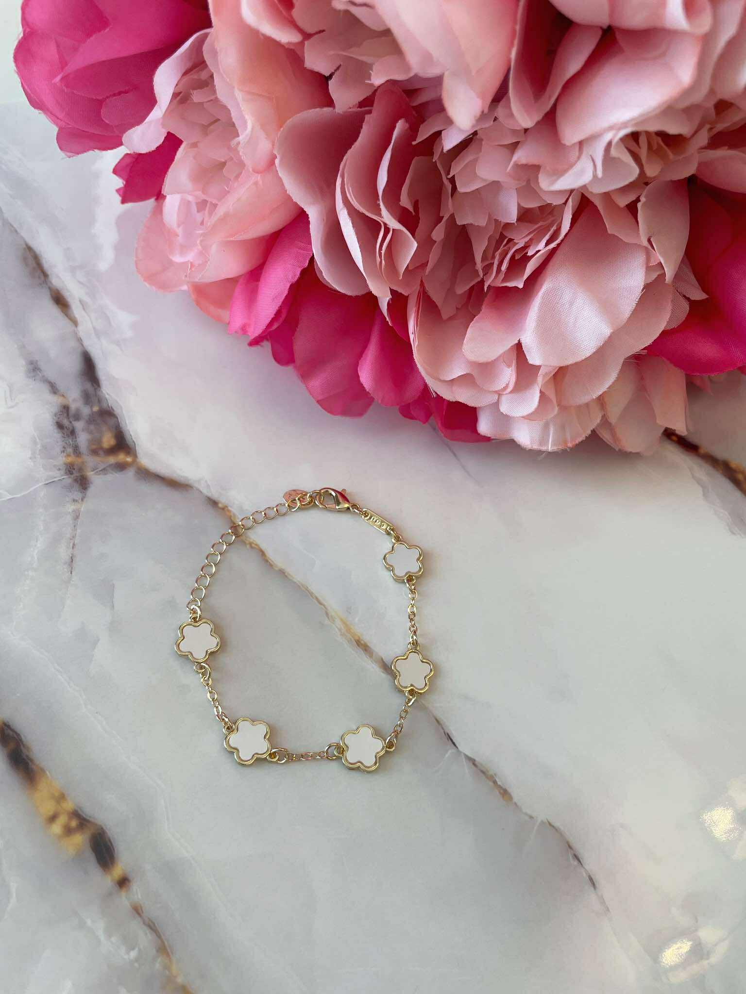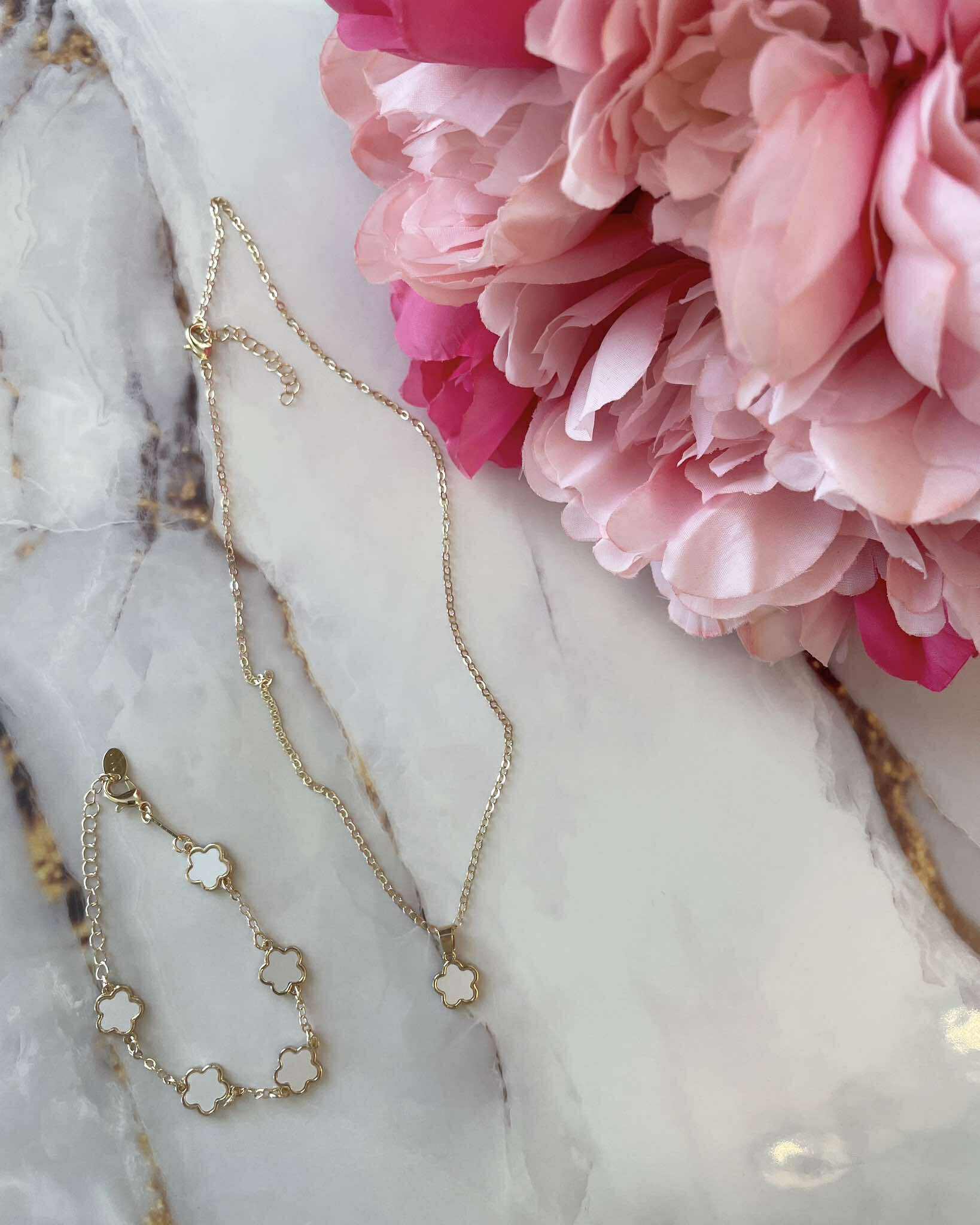 Дизайн: Цвят метал- златист. Цвят декорация – бял. Сетът включва колие и гривна